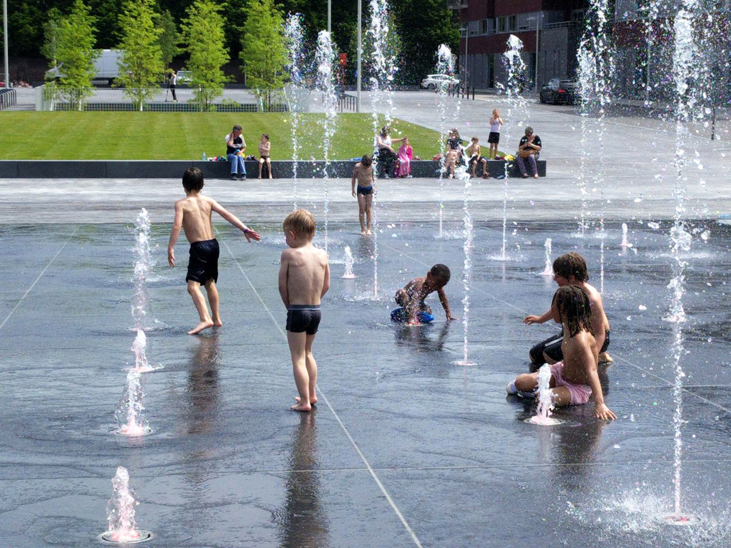 A pedestrian promenade connects the city hall with a new library, bridging a height difference of four meters. Two large staircases planted with trees provide access and light to the parking garage underneath, while water jets become a new destination on the promenade above.